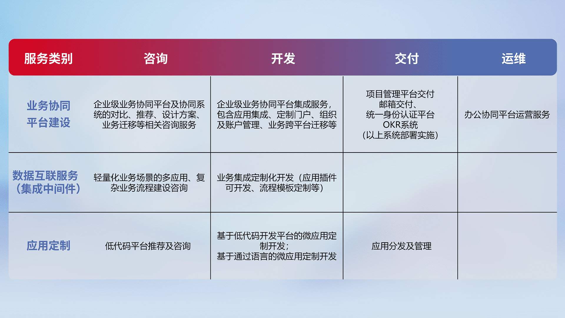 针对钉钉、、、、企微、、IDaas等平台级产品提供产品的规划、、方案、、交付、、、定制化开发等服务,,,,实现如统一协同办公、、智能客户服务、、、、混合会议管理、、智能数据查询、、、等业务场景,,实现数字化转型。。。。